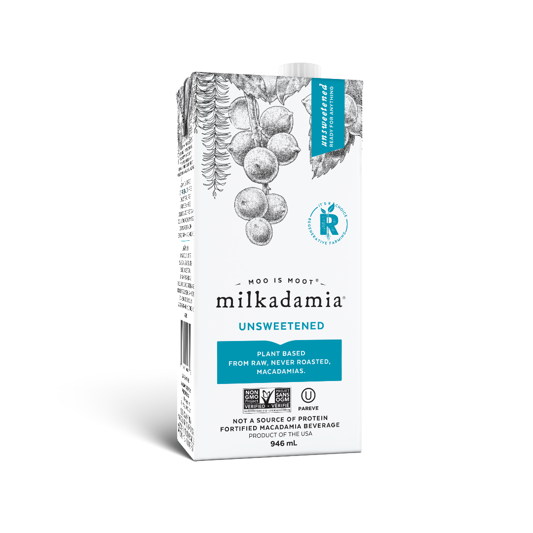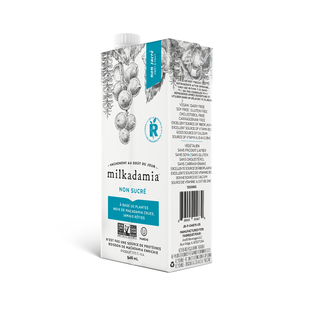 Ingrédients: Lait de macadamia (eau filtrée, noix de macadamia), phosphate de calcium, arômes naturels, protéines de pois, gomme de guar, lécithine de tournesol, sel marin, gomme gellane, sulfate de zinc, acétate de vitamine A, vitamine D2, riboflavine (B2), vitamine B12.