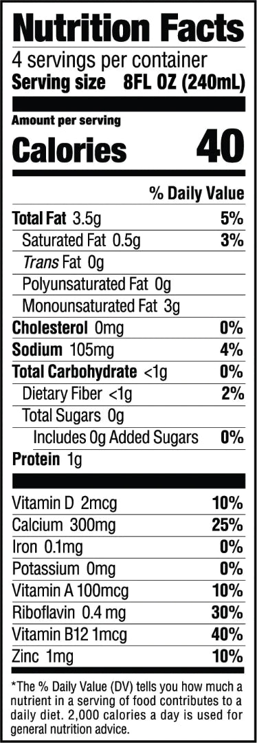 Seulement 40 calories par portion 50% plus de calcium que le lait laitier Excellente source de vitamines D et 12