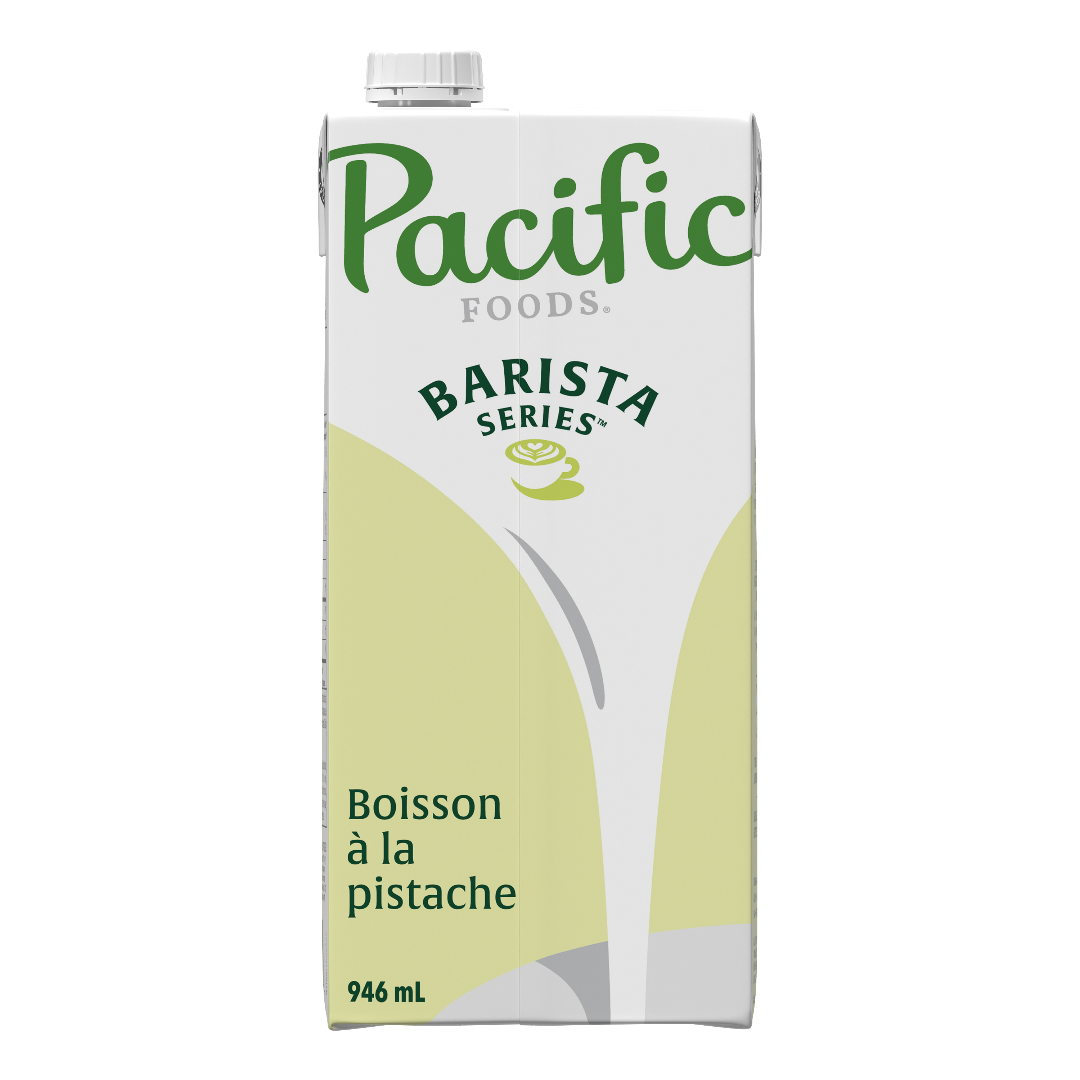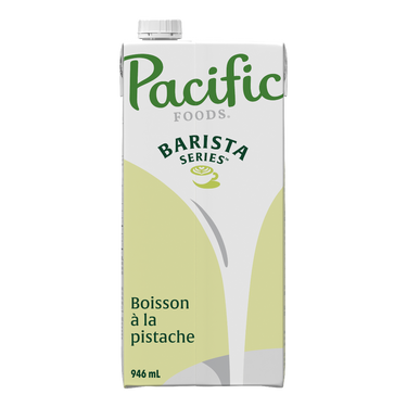 Lait à la pistache (eau, pistaches moulues originaires de Californie, Arizona et Nouveau Mexique, USA), sucre de canne, contient 1 % ou moins de : amidon de riz, phosphate dipotassique, lécithine de tournesol, citrate de sodium, sel marin, gomme gellane, gomme de guar.
