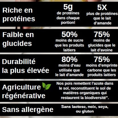 ✔️ Parfaite micro-mousse et neutre. Une saveur semblable au lait. ✔️ Texture onctueuse et crémeuse. ✔️ Faible teneur en sucre avec seulement 4 g de glucides par 240 ml. ✔️ Une empreinte carbone minime. ✔️ Sans allergène ou gluten. ✔️ Fabriqué au Canada avec des ingrédients cultivés localement.