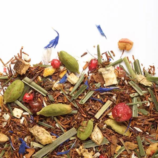 Ingrédients : Rooibos, éclats de pomme, d'orange et de pamplemousse (saveur), cannelle, gingembre, cardamome, noix de coco, citronnelle, poivre rose, centaurée et groseille.