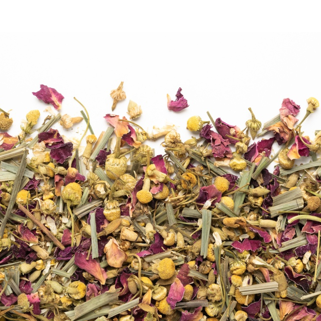 Chamomile, wild rose, lemongrass. (Matricaria recutita, Rosa spp, Cymbopogon citratus)